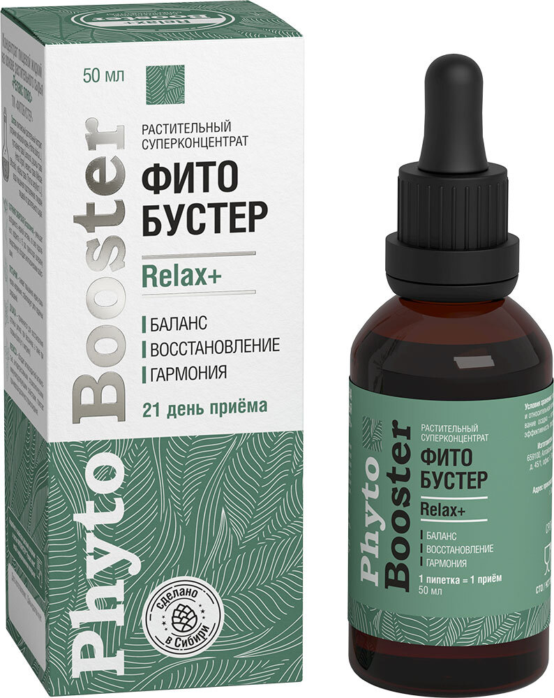 Фитобустер "РЕЛАКС ПЛЮС" (Phytobooster "RELAX+") — концентрированный растительный эликсир направленного действия без сахара, спирта и консервантов в составе.Фитобустер "РЕЛАКС ПЛЮС" — благодаря входящим в его состав активным компонентам помогает телу и разуму поддерживать естественный внутренний баланс: гармонизирует работу симпатической и парасимпатической нервных систем (способствует нормализации сна и эффективному переключению из бодрого состояния в спокойное и наоборот). Повышает стрессоустойчивость организма и способность к самовосстановлению.Патриния сибирская — уменьшает возбудимость нервной системы, по силе седативного эффекта в 15 раз превосходя валериану лекарственную, обладает антитоксическими свойствами.Пустырник — снимает нервно-психическое напряжение, стабилизирует ритм сердечных сокращений.Душица — применяется для восстановления суточных ритмов, при бессоннице, а также при головных болях (в том числе мигренях).Мелисса — обладает антиоксидантной активностью, антидепрессивными, спазмолитическими, иммуномодулирующими свойствами, помогает при неврозах различного происхождения, способствует умиротворению и уравновешенности.Чабрец — эффективен в борьбе со стрессами, способствует восстановлению нервной системы, нормализует психическое состояние.СИЛА ТРАВ — В КАЖДОЙ КАПЛЕ!Для гармонизации повседневных биоритмов рекомендуем использовать Фитобустер "РЕЛАКС ПЛЮС" в сочетании с Фитобустером "ЭНЕРДЖИ ПЛЮС". Совместное употребление этих продуктов даст максимально заметный положительный эффект: бодрость и хорошую работоспособность в течение дня, расслабленность и качественное восстановление сил в вечернее время и во время ночного сна.Состав комплексный растительный экстракт (патринии сибирской корень, пустырника трава, душицы трава, мелиссы трава, чабреца трава), вода очищенная подготовленная, глицерин пищевой.Способ применения 1 пипетку (~1 мл продукта) развести в 50 мл воды (1/4 стакана), принимать два раза в день.Противопоказания индивидуальная непереносимость компонентов. При наличии хронических заболеваний перед начало употребления продукта рекомендуем проконсультироваться с лечащим врачом.Направленность:: антистресс, здоровый сонСрок годности: : 2 годаОбъём: 50 млУпаковка: : стеклянный флакон с пипеткой-капельницей, картонный пеналРежим хранения: : от 0°С до +25°С и относительной влажности воздуха не более 75%.Изготовитель: : ООО АФЦ «Алтайский нектар»Страна: : Россия