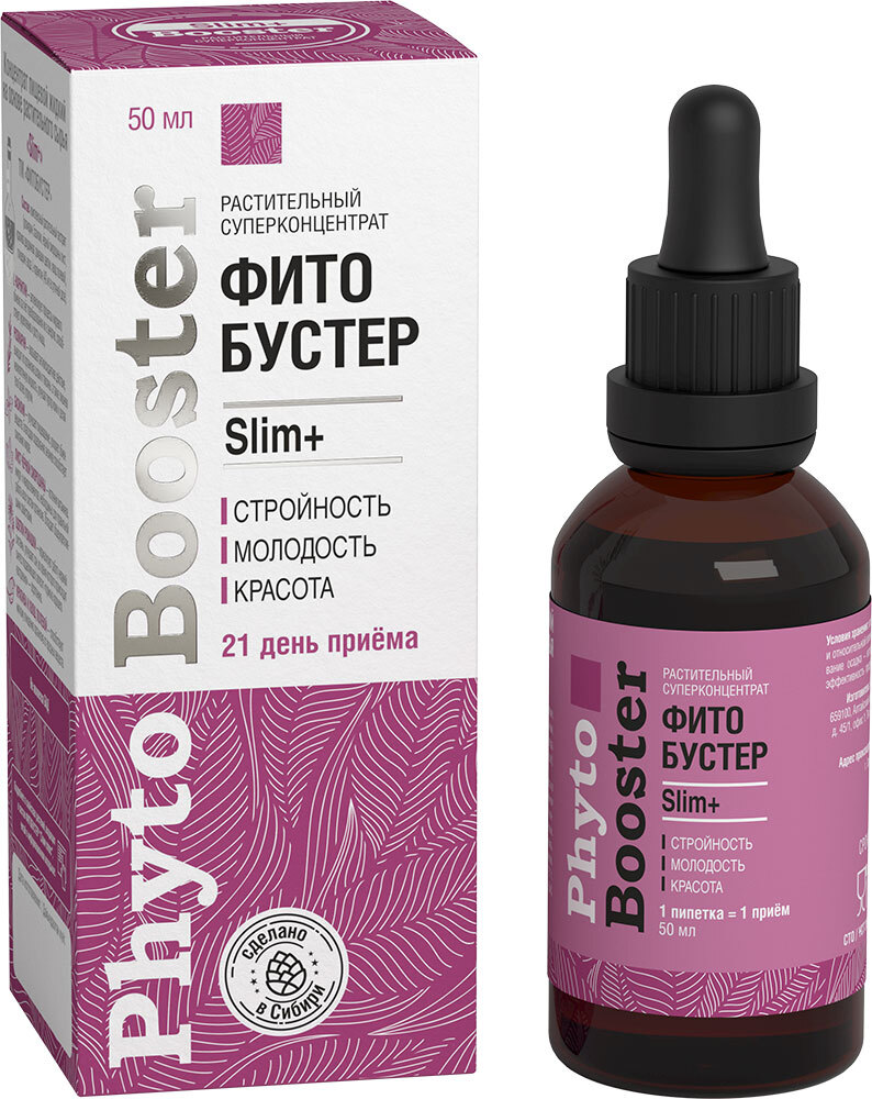 Фитобустер "СЛИМ ПЛЮС" (Phytobooster "SLIM+") — концентрированный растительный эликсир направленного действия без сахара, спирта и консервантов в составе.Фитобустер "СЛИМ ПЛЮС" — благодаря входящим в его состав активным компонентам оказывает антиоксидантное действие, способствует улучшению обмена веществ, помогает обрести красивое и подтянутое тело. Значительно повышает эффективность спортивных тренировок. Укрепляет иммунитет и усиливает защитные силы организма.L-карнитин — "аптечный" жиросжигатель, активизирует энергетический обмен, преобразуя жировые запасы в энергию, повышает выносливость во время физических нагрузок.Розмарин — природный антиоксидант, способствует выведению лишней жидкости из организма и уменьшению объёмов за счёт снижения отёчности тканей.Базилик — ускоряет метаболизм и тонизирует, участвует в процессе жиросжигания, делая его более интенсивным и результативным за счёт содержащихся в растении энзимов.Лист чёрной смородины — источник витаминов, микро- и макроэлементов, необходимых для правильной работы всех органов и систем.Крапива двудомная — способствует мягкому очищению организма от шлаков и токсинов, укрепляет иммунитет.Цветки ромашки — успокаивает и расслабляет, улучшает сон, во время которого происходит синтез подавляющего аппетит "гормона хорошего настроения" — серотонина.Хвощ полевой — нормализует обменные процессы, подавляет аппетит.СИЛА ТРАВ — В КАЖДОЙ КАПЛЕ!Для достижения наилучшего результата в период приёма Фитобустера "СЛИМ ПЛЮС" рекомендуется пить больше воды и вести активный образ жизни.Состав комплексный растительный экстракт (розмарин обыкновенный (Rosmarinus), базилик (Ocimumbasilicum), чёрной смородины лист (Ribesnigrum L.), крапива двудомная (Urtícadióica), ромашки цветки (Chamomilla), хвощ полевой (Equisetumarvense L.)), глицерин, вода.Способ применения 1 пипетку (≈ 20-22 капли) развести в 50 мл воды (1/4 стакана), принимать два раза в день.Противопоказания индивидуальная непереносимость компонентов. Перед началом употребления продукта следует проконсультироваться с лечащим врачом. Не является лекарственным средством.Направленность:: похудение.Срок годности: : 2 года.Объём: 50 мл.Упаковка: : стеклянный флакон с пипеткой-капельницей, картонный пенал.Режим хранения: : от 0 °С до +25 °С и относительной влажности воздуха не более 75 %.Изготовитель: : ООО АФЦ «Алтайский нектар»Страна: : Россия