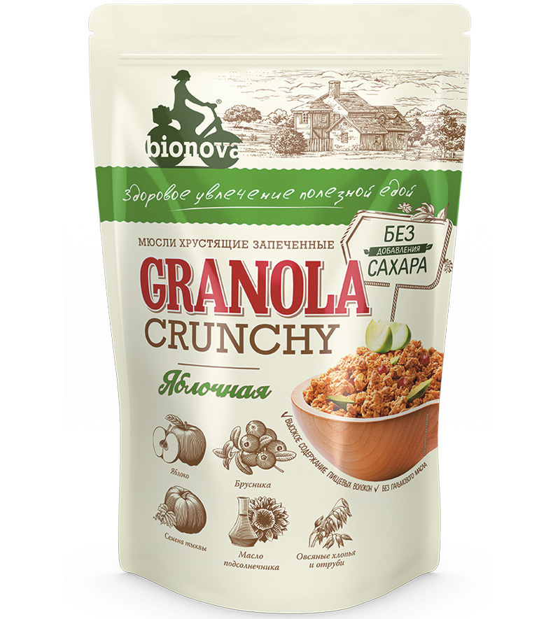 Мюсли Бионова Яблочные, 400г.http://darypamira.ru/product/myusli-bionova-yablochnye-400gМюсли на завтрак – возможность сэкономить время и не вставать на полчаса раньше, чтобы приготовить сложное блюдо. А еще — верный способ запастись хорошим настроением на целый день. Хрустящие хлопья с кусочками яблок, брусникой, семенами тыквы и злаками нужно только залить водой или молоком. Благодаря вакуумной сушке яблоко и брусника полностью сохраняют входящие в состав витамины А, В, С и Е, полезные вещества. Высокое содержание пектина стимулирует обмен веществ и позволяет вывести из организма вещества, которые могут негативно повлиять на его работу. Состав: запеченные хрустящие мюсли (хлопья овсяные, растительные пищевые волокна, овсяные и пшеничные отруби, пшеничная и рисовая мука, подсолнечное масло, подсластитель сукралоза из растительного сырья, ячменный солод, соль);семена тыквы;сушеные яблоки, брусника;корица. Фрукты, ягоды и зерновые продукты содержат сахар естественного происхождения.Не содержат:сахара;красителей и консервантов;пальмового масла (калорийность мюсли на 15% ниже аналогов).ГМО и холестерина.Пищевая ценность на 100 г: белки — 4,4 г,растительные жиры — 4,8 г, углеводы — 19,7 г,пищевые волокна — 8,7 г.Энергетическая ценность на 100 г: 155 Ккал.Условия хранения: хранить при температуре не более +25°С и относительной влажности воздуха не выше 75%. Вскрытый пакет хранить плотно закрытым, в сухом месте. Рекомендуется полностью использовать в течение месяца (т.к. мюсли впитывают влагу).Срок годности: 12 мес. Вес: 400 гИзготовитель: ООО «НоваПродукт АГ»Страна: Россия