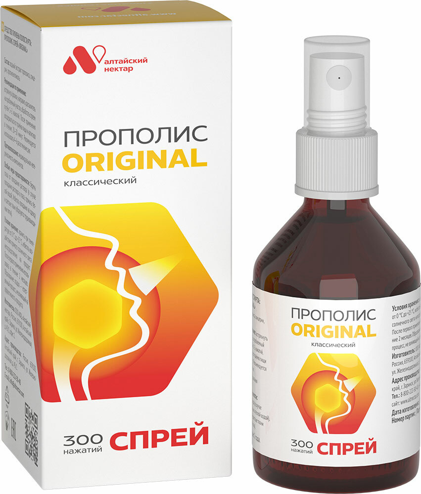 Прополис-спрей "ORIGINAL" — многофункциональное средство обладающее антибактериальным, противогрибковым, противовирусным, местным анестезирующим и противовоспалительным действием. Сохраняет здоровую микрофлору полости рта и горла, способствует поддержанию здоровья дёсен и зубов, предотвращая размножение патогенных бактерий, вызывающих кариес, освежает дыхание.Прополис — благодаря высокому содержанию фитоницидов, эфирных масел, аминокислот, витаминов и микроэлементов укрепляет местный иммунитет, обладает мощными антисептическими свойствами, пролонгированным защитным действием в отношении вирусов, бактерий и грибов, оказывает обезболивающее действие.Западные учёные называют прополис "русским пенициллином", сравнивая его силу с одним из самых популярных антибактериальных препаратов. Но, в отличие от синтетических антибиотиков, прополис не оказывает побочных эффектов на организм человека (не угнетает полезную микрофлору, не приводит к дисбактериозу и снижению природного иммунитета), не вызывает выработки устойчивости к своему воздействию у микробов.Прополисный спрей эффективен: При заболеваниях ЛОР-органов и верхних дыхательных путей (фарингиты, ларингиты, тонзиллиты, трахеиты, бронхиты и др.); При различных стоматологических проблемах (стоматитах, гингивитах, пародонтитах и др.); При бактериальных и грибковых поражениях кожи, герпетических высыпаниях.Спрей удобен в использовании, экономичен (1 флакон = 300 распылений) и не содержит спирта, поэтому может использоваться лицами, которым противопоказано употребление алкоголесодержащих препаратов.Не вызывает побочных эффектов и привыкания, свойственных синтетическим препаратам.Состав водные экстракты прополиса, пропиленгликоль, глицерин.Способ применения встряхнуть флакон, направить распылитель на проблемный участок, обработать спреем путём 1-2 нажатий.Противопоказания индивидуальная непереносимость компонентов средства.Натуральный бесспиртовой спрей для полости рта и горла на основе пчелиного прополиса. Обладает противовоспалительными и антисептическими свойствами (эффективен против большинства инфекционных возбудителей: грибков, бактерий и вирусов).Активные компоненты: прополис пчелиный.Категория:: средства гигиены полости ртаНаправленность:: гигиена полости ртаСрок годности: : 24 месяцаОбъём: 50 млУпаковка: : флакон из затемнённого стекла, картонный пеналРежим хранения: : хранить при температуре не выше +25°С, избегать воздействия прямых солнечных лучей. Возможно образование естественного осадка, не влияющего на эффективность продукта.Изготовитель: : ООО ТД «ИВАН ДА»Страна: : Россия