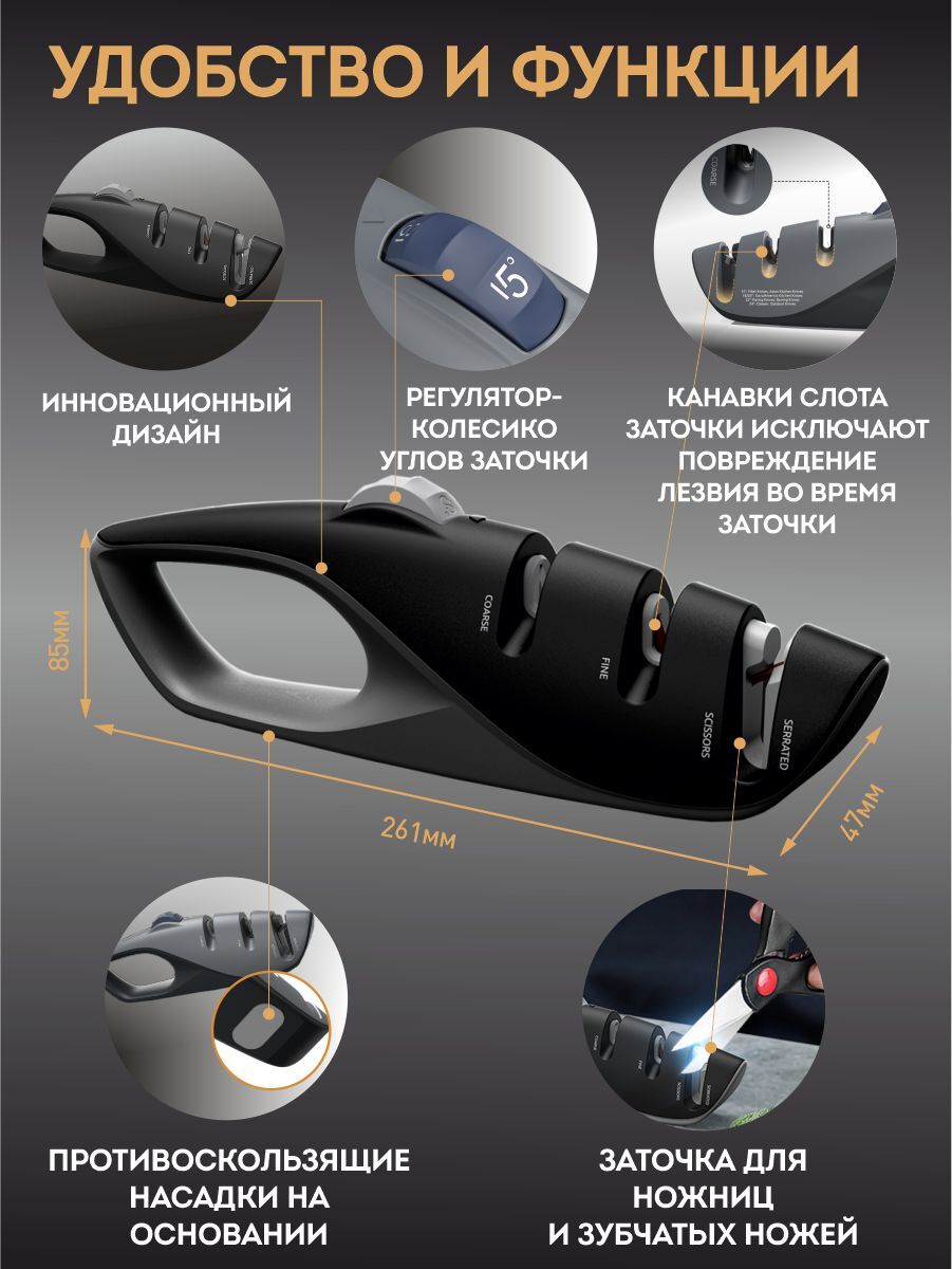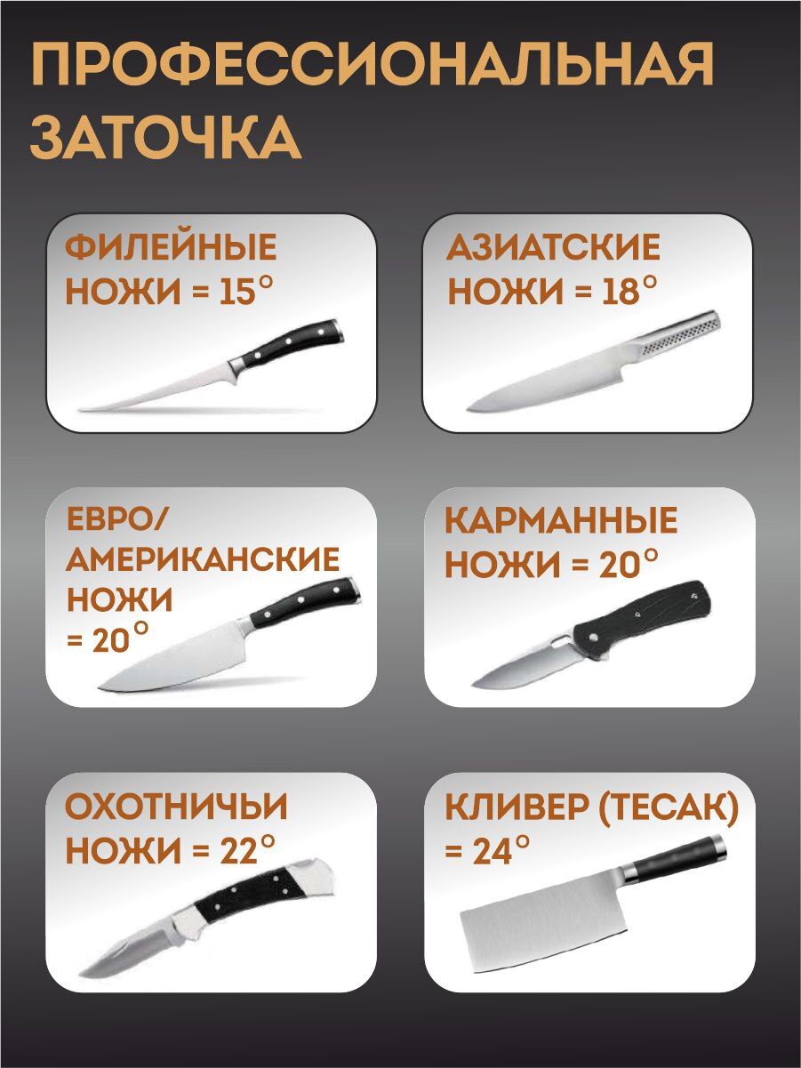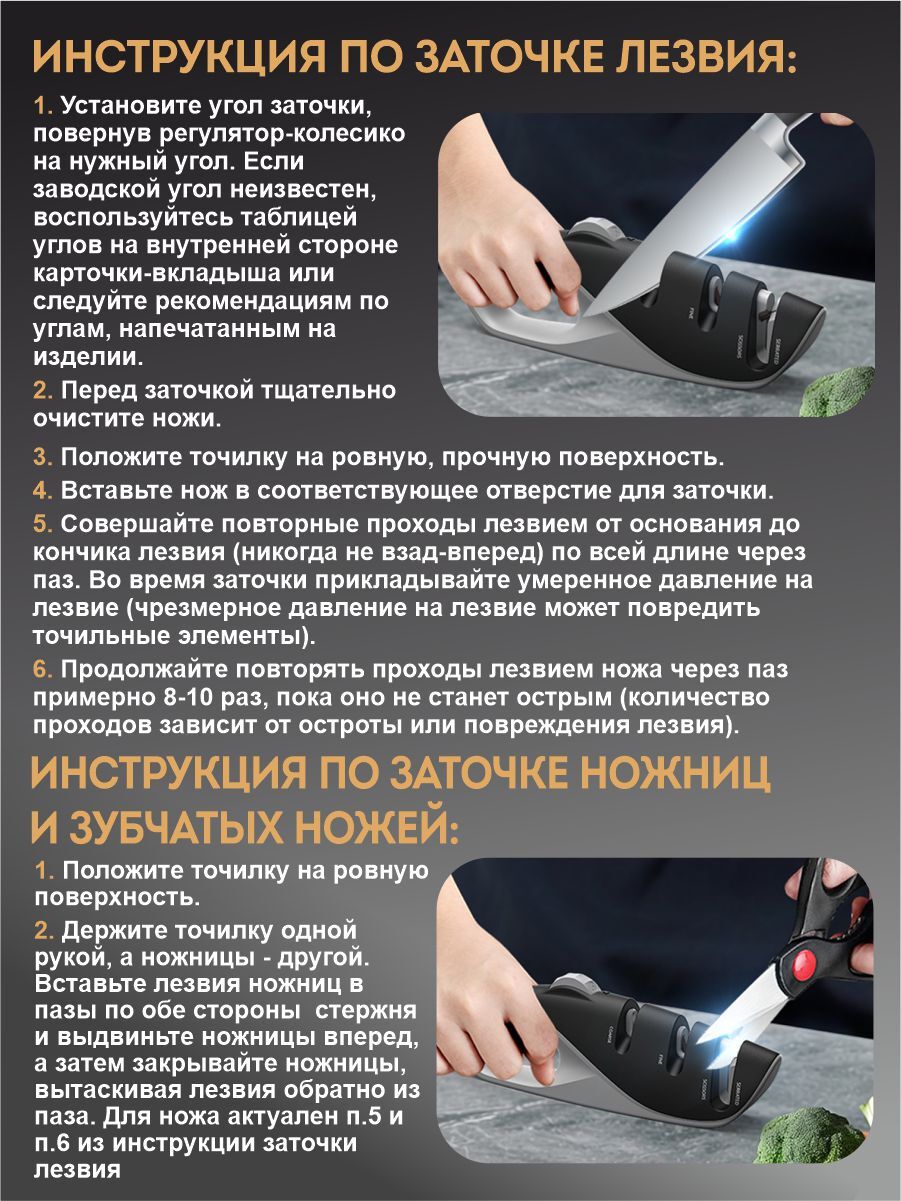 Точилка для ножей с несколькими углами заточки1.Пять углов заточки для разных ножей 2.Автоматическая настройка точной заточки для разных ножей3.Улучшенные материалы для заточки - алмазная смола4.Более удобная заточка благодаря дизайну5.В пять раз увеличенный срок службы благодаря твердосплаву с 5 установками6.Специальный шлифовальный вал как для ножниц, так и для зубчатых лезвий.ХАРАКТЕРИСТИКИ ПРОДУКТА1.Пять углов для разных ножей 2.Автоматическая настройка точной заточки для разных ножей3.Улучшенные материалы для заточки: алмазная смола4.Более удобная заточка благодаря дизайну5.В пять раз увеличенный срок службы благодаря твердосплавным элементам заточки6.Специальный шлифовальный вал как для ножниц, так и для зубчатых лезвий.Инструкции по заточке ножа Straight Edge:1. Во время работы установите точилку с регулируемым углом заточки на ровную и устойчивую поверхность2. Установите угол заточки, повернув ручку регулировки угла и установив его на нужный угол. Если заводской угол неизвестен, воспользуйтесь таблицей углов, указанной на самой точилке или упаковке.3. Вставьте лезвие ножа в слот ""COARSE"" у основания со стороны ручки ножа.4. Слегка надавите на лезвие, одновременно втягивая его обратно в прорезь. Повторите это действие 5-8 раз, 5 раз для слегка затупленного лезвия и более для сильно затупленного.5. После ""грубой заточки""(COARSE) обработайте лезвие в слоте ""FINE"" от 3 до 5 раз.Инструкции к ножницам:Шаг 1: Выберите слот для для ножниц (SCISSORS). Держите точилку для ножей левой рукой, а ножницы - правой.Шаг 2: Вставьте лезвия ножниц в пазы с обеих сторон керамического стержня и выдвиньте ножницы вперед, а затем закройте ножницы и вытяните их обратно из паза.ВНИМАНИЕ! ВАЖНО!1.Данная точилка несовместима с керамическими ножами. Не ставьте точилку в посудомоечную машину.2.Нельзя затачивать нож двжением ""взад-вперед"", используйте движение ""протягивание"" в одном направлении - от ручки до кончика лезвия!3.Не давите сильно на нож при заточке.4.Храните точилку и ножи в недоступном для детей месте во избежание несчастных случаев.