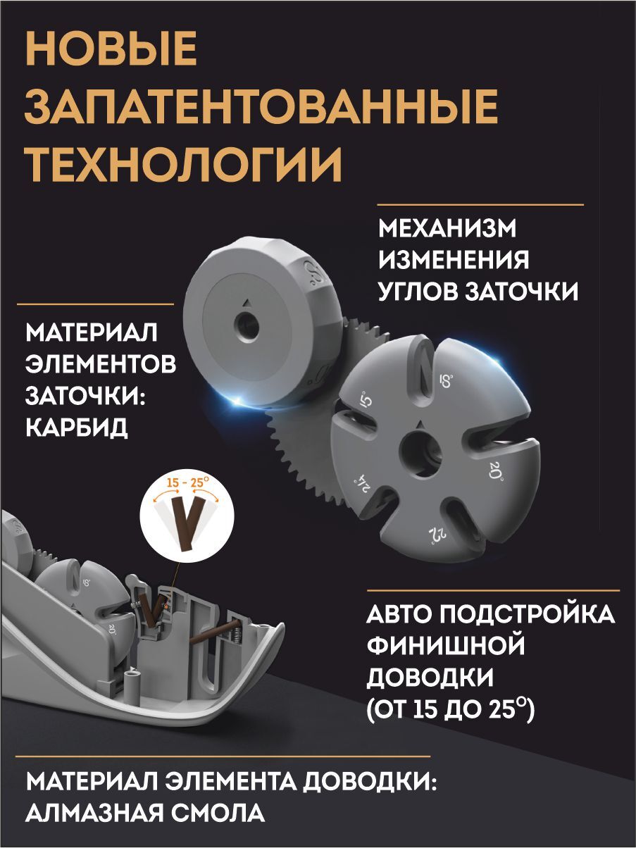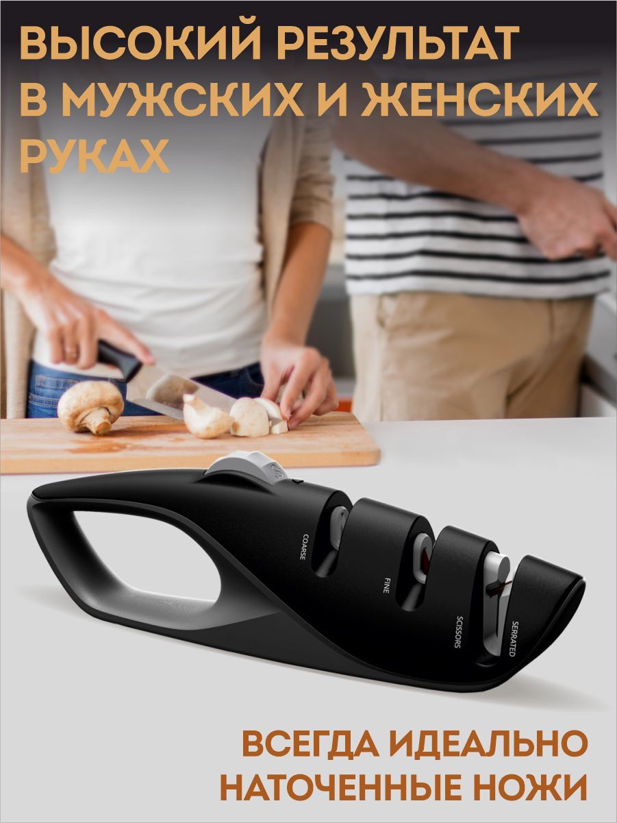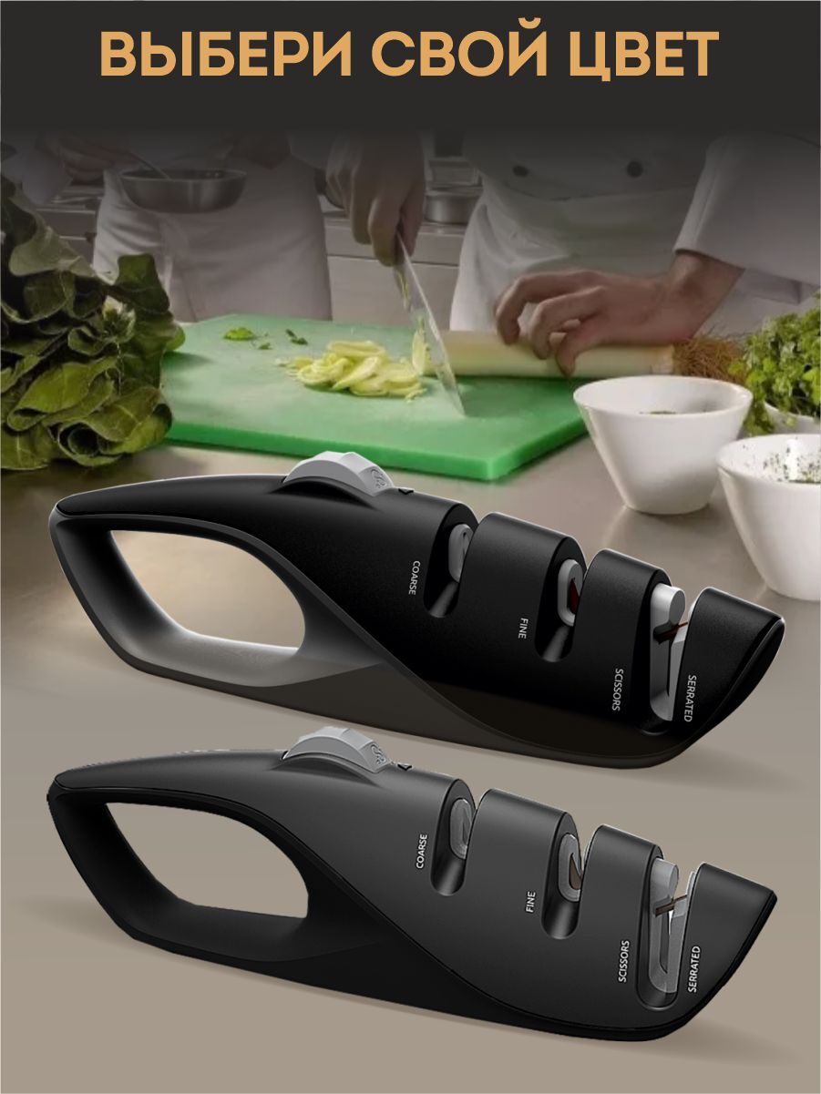 Точилка для ножей с несколькими углами заточки1.Пять углов заточки для разных ножей 2.Автоматическая настройка точной заточки для разных ножей3.Улучшенные материалы для заточки - алмазная смола4.Более удобная заточка благодаря дизайну5.В пять раз увеличенный срок службы благодаря твердосплаву с 5 установками6.Специальный шлифовальный вал как для ножниц, так и для зубчатых лезвий.ХАРАКТЕРИСТИКИ ПРОДУКТА1.Пять углов для разных ножей 2.Автоматическая настройка точной заточки для разных ножей3.Улучшенные материалы для заточки: алмазная смола4.Более удобная заточка благодаря дизайну5.В пять раз увеличенный срок службы благодаря твердосплавным элементам заточки6.Специальный шлифовальный вал как для ножниц, так и для зубчатых лезвий.Инструкции по заточке ножа Straight Edge:1. Во время работы установите точилку с регулируемым углом заточки на ровную и устойчивую поверхность2. Установите угол заточки, повернув ручку регулировки угла и установив его на нужный угол. Если заводской угол неизвестен, воспользуйтесь таблицей углов, указанной на самой точилке или упаковке.3. Вставьте лезвие ножа в слот ""COARSE"" у основания со стороны ручки ножа.4. Слегка надавите на лезвие, одновременно втягивая его обратно в прорезь. Повторите это действие 5-8 раз, 5 раз для слегка затупленного лезвия и более для сильно затупленного.5. После ""грубой заточки""(COARSE) обработайте лезвие в слоте ""FINE"" от 3 до 5 раз.Инструкции к ножницам:Шаг 1: Выберите слот для для ножниц (SCISSORS). Держите точилку для ножей левой рукой, а ножницы - правой.Шаг 2: Вставьте лезвия ножниц в пазы с обеих сторон керамического стержня и выдвиньте ножницы вперед, а затем закройте ножницы и вытяните их обратно из паза.ВНИМАНИЕ! ВАЖНО!1.Данная точилка несовместима с керамическими ножами. Не ставьте точилку в посудомоечную машину.2.Нельзя затачивать нож двжением ""взад-вперед"", используйте движение ""протягивание"" в одном направлении - от ручки до кончика лезвия!3.Не давите сильно на нож при заточке.4.Храните точилку и ножи в недоступном для детей месте во избежание несчастных случаев.