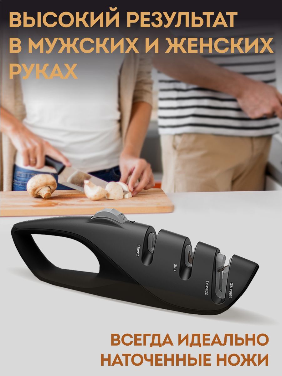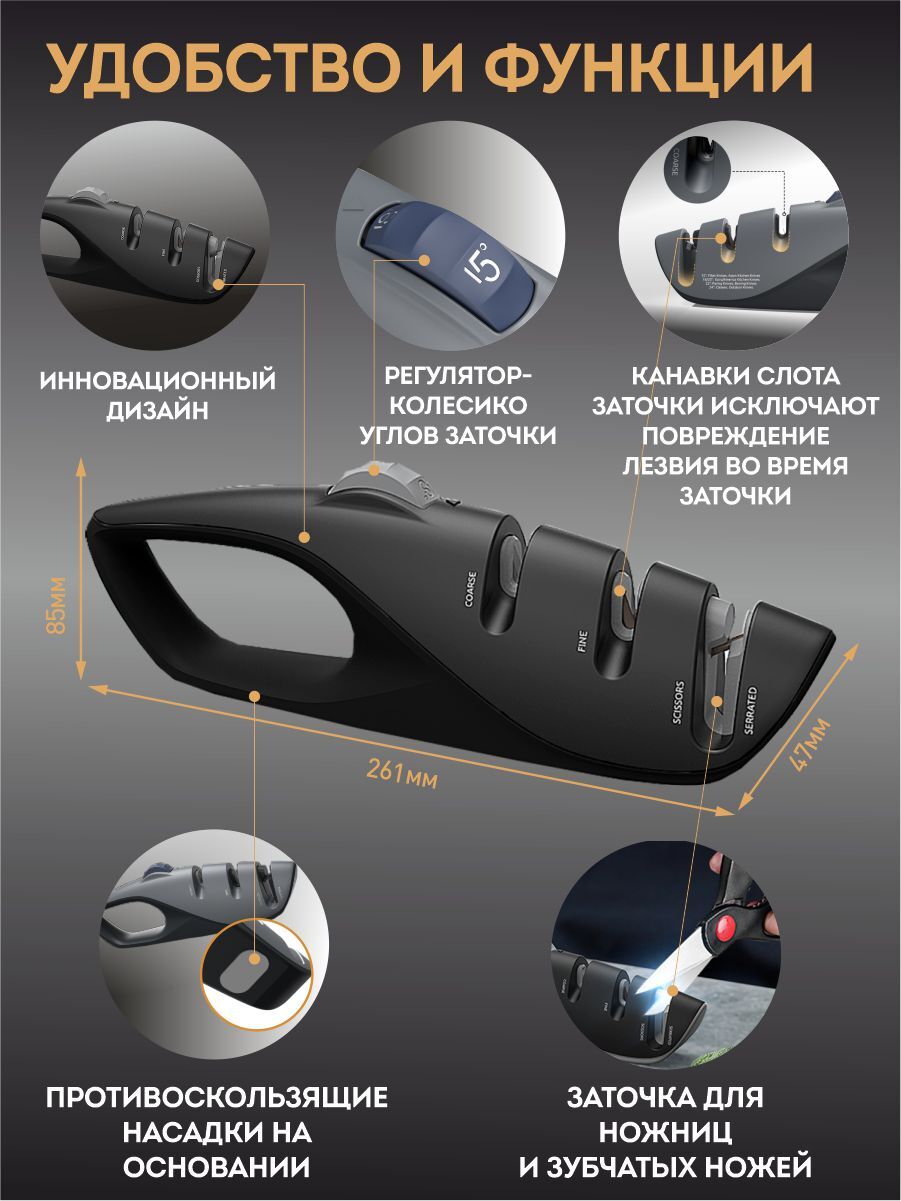 Точилка для ножей с несколькими углами заточки1.Пять углов заточки для разных ножей 2.Автоматическая настройка точной заточки для разных ножей3.Улучшенные материалы для заточки - алмазная смола4.Более удобная заточка благодаря дизайну5.В пять раз увеличенный срок службы благодаря твердосплаву с 5 установками6.Специальный шлифовальный вал как для ножниц, так и для зубчатых лезвий.ХАРАКТЕРИСТИКИ ПРОДУКТА1.Пять углов для разных ножей 2.Автоматическая настройка точной заточки для разных ножей3.Улучшенные материалы для заточки: алмазная смола4.Более удобная заточка благодаря дизайну5.В пять раз увеличенный срок службы благодаря твердосплавным элементам заточки6.Специальный шлифовальный вал как для ножниц, так и для зубчатых лезвий.Инструкции по заточке ножа Straight Edge:1. Во время работы установите точилку с регулируемым углом заточки на ровную и устойчивую поверхность2. Установите угол заточки, повернув ручку регулировки угла и установив его на нужный угол. Если заводской угол неизвестен, воспользуйтесь таблицей углов, указанной на самой точилке или упаковке.3. Вставьте лезвие ножа в слот ""COARSE"" у основания со стороны ручки ножа.4. Слегка надавите на лезвие, одновременно втягивая его обратно в прорезь. Повторите это действие 5-8 раз, 5 раз для слегка затупленного лезвия и более для сильно затупленного.5. После ""грубой заточки""(COARSE) обработайте лезвие в слоте ""FINE"" от 3 до 5 раз.Инструкции к ножницам:Шаг 1: Выберите слот для для ножниц (SCISSORS). Держите точилку для ножей левой рукой, а ножницы - правой.Шаг 2: Вставьте лезвия ножниц в пазы с обеих сторон керамического стержня и выдвиньте ножницы вперед, а затем закройте ножницы и вытяните их обратно из паза.ВНИМАНИЕ! ВАЖНО!1.Данная точилка несовместима с керамическими ножами. Не ставьте точилку в посудомоечную машину.2.Нельзя затачивать нож двжением ""взад-вперед"", используйте движение ""протягивание"" в одном направлении - от ручки до кончика лезвия!3.Не давите сильно на нож при заточке.4.Храните точилку и ножи в недоступном для детей месте во избежание несчастных случаев.